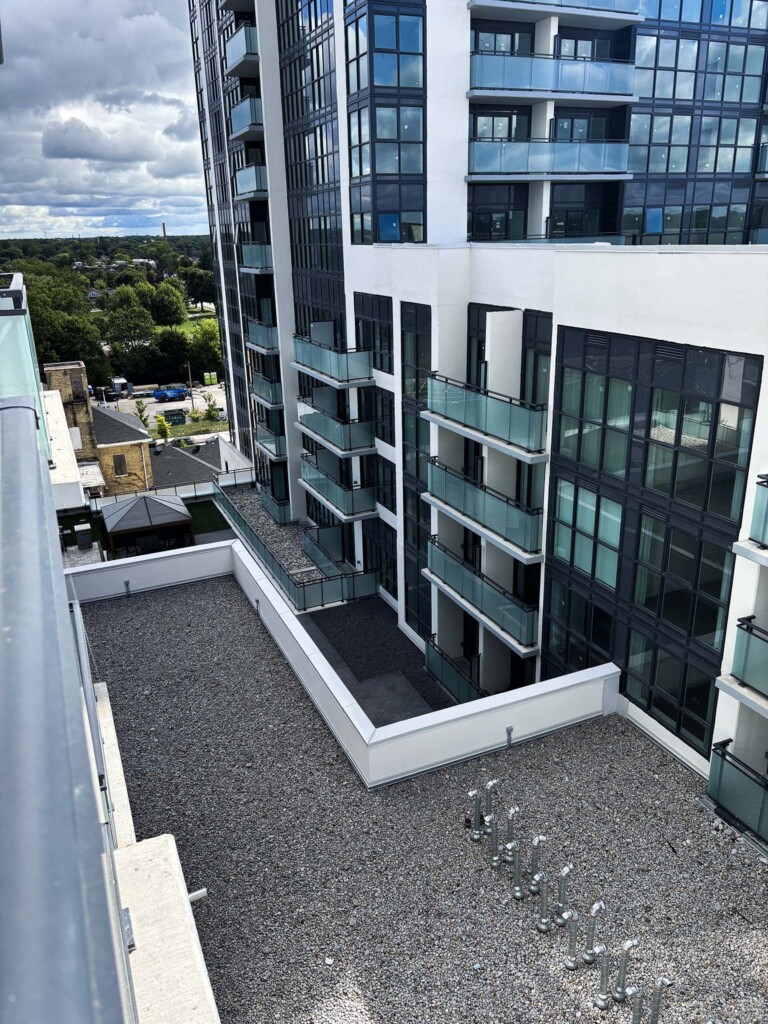 View of SOHOSQ balconies and windows from above, overlooking a gravel rooftop courtyard with utility vents.
